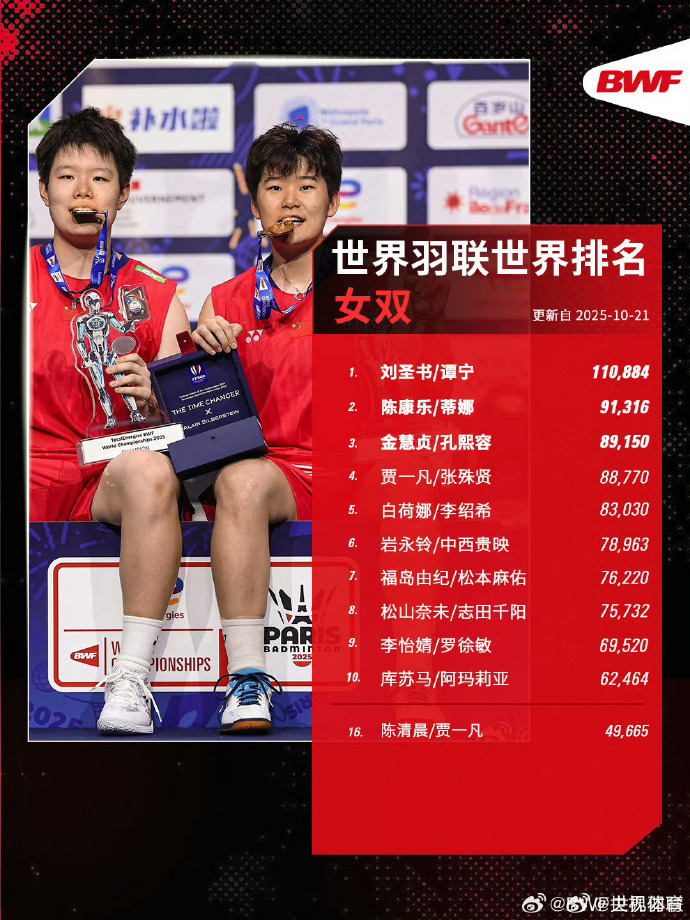 世界羽聯(lián)2025年第43周世界排名揭曉,中國(guó)隊(duì)強(qiáng)勢(shì)包攬三項(xiàng)世界第一:石宇奇(男單)、劉圣書(shū)/譚寧(女雙)、蔣振邦/魏雅欣(混雙)均以10萬(wàn)+高分繼續(xù)領(lǐng)跑各單項(xiàng)第一。